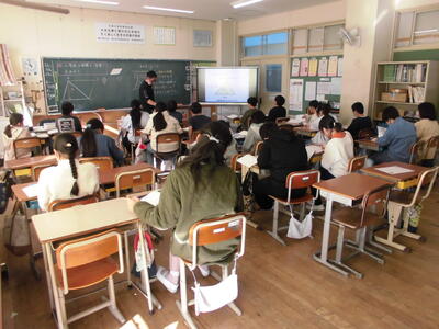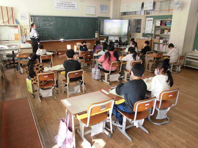 青空の広がる暖かい午前中です。2校時目の授業の様子です。1年生は算数の授業でした。ライオンの数を数える問題を解いていました。3年生も算数の授業でした。てんびんとつみきを使って物の重さを量る活動を行っていました。6年生は保健体育の授業でした。未成年の飲酒の害について学習していました。どの学年も2学期のまとめをがんばっています。