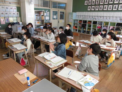 青空の広がる暖かな午前中です。1校時目の授業の様子です。1年生は国語の授業でした。物語文「おかゆのおなべ」の音読をしっかり練習していました。2年生も国語の授業でした。説明文のプリントを集中して解いていました。3年生は算数の授業でした。計算のプリントを行った後、ランドセルの重さを量る学習を行っていました。今日も子どもたちは集中して学習に取り組んでいます。