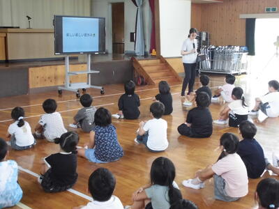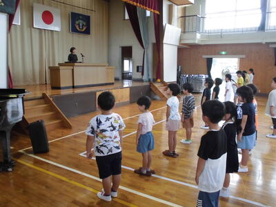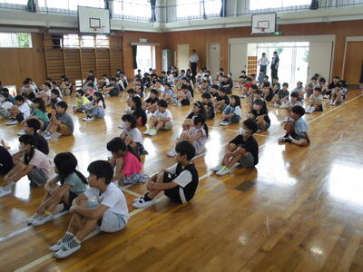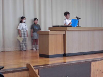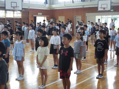 2校時目に全校生が体育館に集まり、終業式を行いました。校長の話の後、2、4、6年生の代表の子が、1学期がんばったことの発表を行いました。どの子もはっきりと発表することができました。会が終わってから、生徒指導担当の先生より夏休みの生活についてクイズ形式で話をしました。子どもたちはしっかりと話を聞いていました。安全で楽しい夏休みにして欲しいと思います。