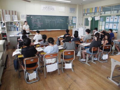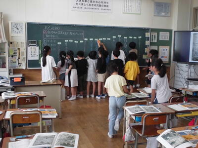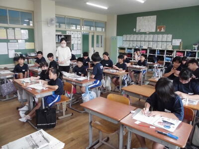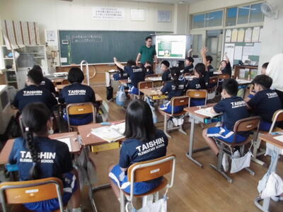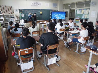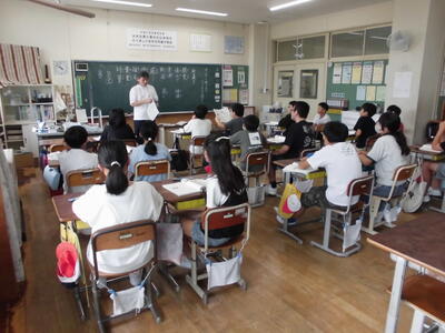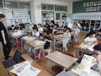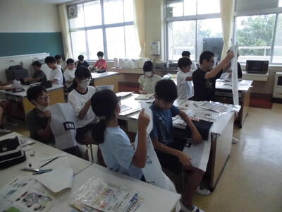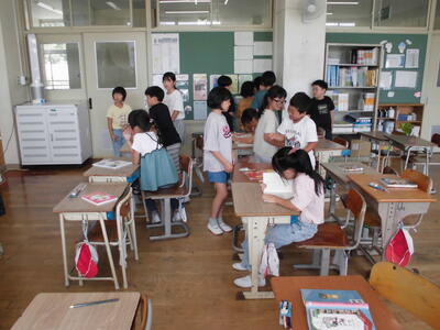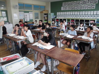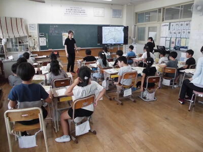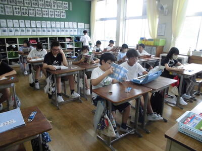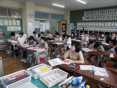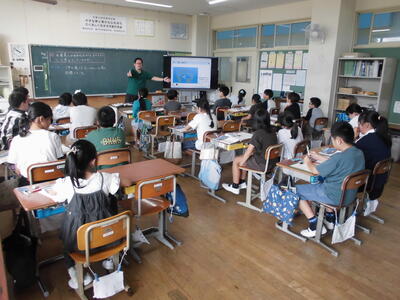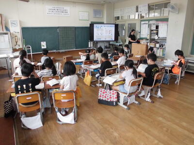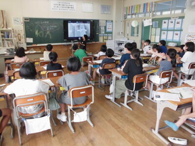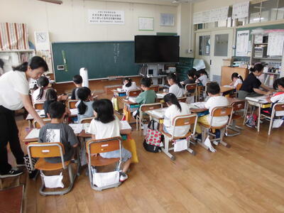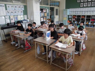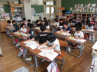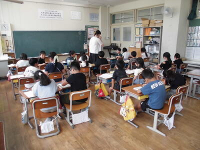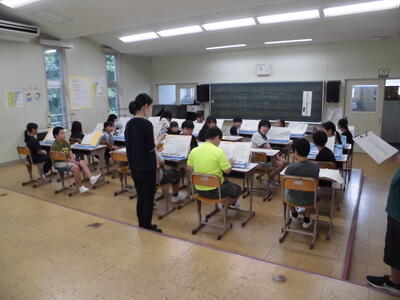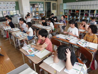 風はありますが、だんだん暑くなってきました。2校時目の授業の様子です。4年生は図工の授業でした。自分で考えたへんてこ山の物語を発表していました。5年生は社会の授業でした。水産業の漁の仕方について学習していました。6年生は家庭の授業でした。ナップザックを作る手順を確認していました。週始めの月曜日ですが子どもたちは元気に生活しています。