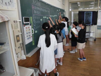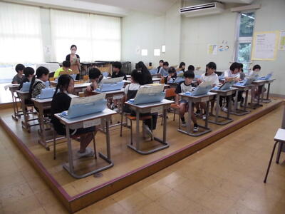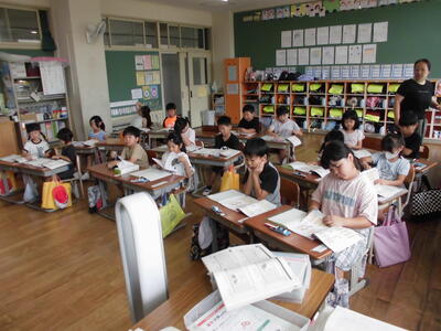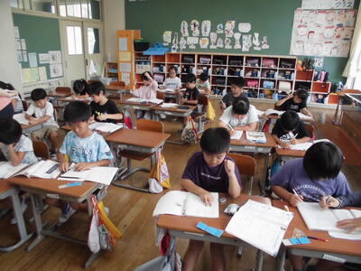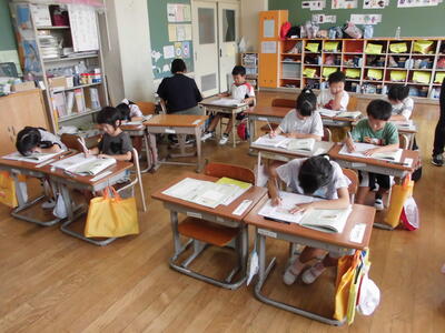 2学期の2日目です。3校時目の授業の様子です。1年生は書写の授業でした。横書きの書き方を集中して練習していました。2年生は国語の授業でした。雨の降り方の様子を表す言葉を、たくさん集めていました。3年生は学活でした。2学期の学級の係を決めて、計画を立てていました。今日も子どもたちは、元気に生活しています。