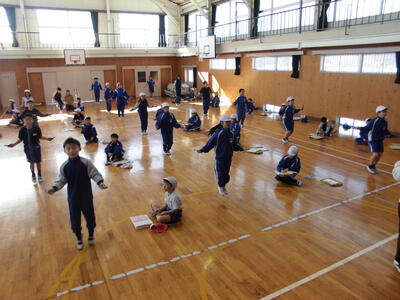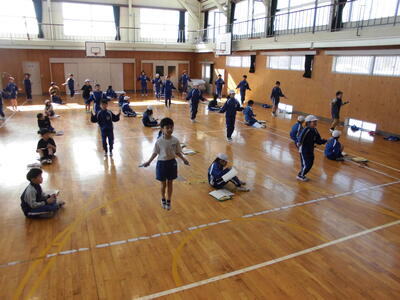 3校時目に3、4年生のなわとび記録会が行われました。3、4年生は持久跳び3分間に挑戦しました。さすが中学年、3分間跳びきる子がたくさんいました。後ろ跳びなどの種目にも一生懸命取り組んでいました。みんなが真剣にがんばったなわとび記録会でした。