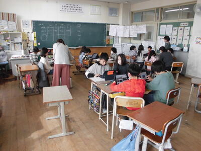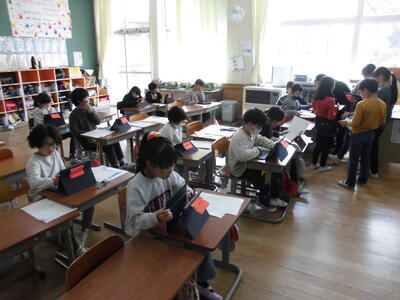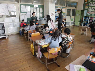 曇り空の穏やかな午前中です。3校時目の授業の様子です。1年生は体育の授業でした。跳び箱の学習の前にウォーミングアップをがんばっていました。2年生は生活科の授業でした。自分が赤ちゃんだった頃の様子をタブレットでまとめていました。3年生は社会科の授業でした。昔の道具や生活についてタブレットで調べていました。どの学年も、授業の中でタブレットを有効に活用しています。