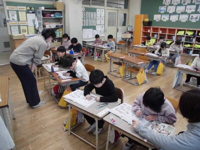 日差しが暖かな午前中です。2校時目の授業の様子です。2年生は国語の授業でした。2年生で楽しかったことを文章で書く計画を立てていました。3年生は算数の授業でした。何倍かを求めるときはどんな式を立てればよいか学習していました。4年生も算数の授業でした。小数のわり算の計算の仕方を話し合っていました。三連休前の今日も、子どもたちは元気に生活しています。