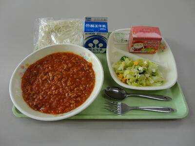 スパゲティミートソースの赤と、星形チーズ入りイタリアンサラダの緑で、おぼんの上はすっかりクリスマス。デザートにはいちごクリームのケーキがついて、子どもたちからはたくさん笑顔がこぼれていました。