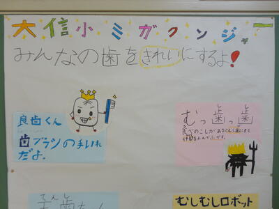 その名も「大信小ミガクンジャー」です。1年間、よい歯を守る取り組みの様々な場面で、彼らが登場します。