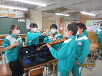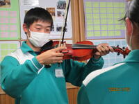 先日の2年生・音楽の授業では、バイオリン体験を行いました。現在休部中の音楽部は、管弦楽で本校にはバイオリンがあります。生徒は初めて触るバイオリンに興味津々のようでした。