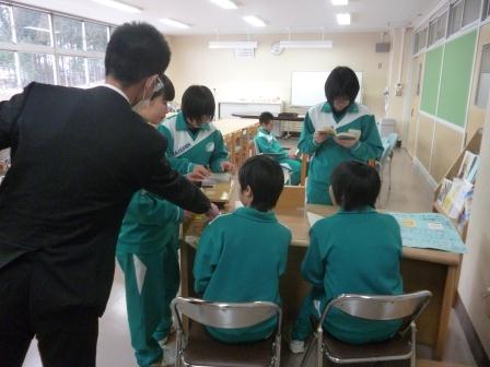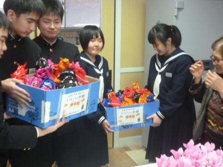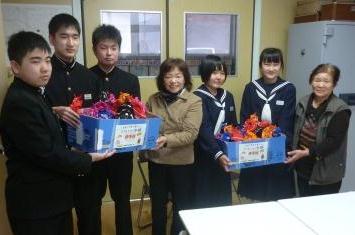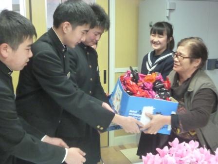 1月22日、大信商工会婦人部の皆さんから3年生と先生に伊予柑をいただきました。大寒から2月にかけての一番寒い時期、「ビタミンたっぷりの伊予柑を食べて受験を乗り切って!」とエールをもらい、代表の室井さん、満山さん、渡部君、大木君、佐藤君が受け取りました。3年生に「い~予感」があること間違いなしです。ありがとうございました。