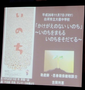 11月7日、健康教育講演会を行いました。今年度のテーマは、「かけがえのない命~いのちをまもる、いのちをそだてる」。助産師の吉岡利恵先生を講師にお招きし、大変ためになるお話しをしていただきました。命の始まりから「わたしが決まるとき」、私たちのさいしょのかたちを配られた黒画用紙を透かして見せていただいたり、命のリレーを具体的に見せていただいたりととてもわかりやすいお話でした。「自分のいのちがたくさんの命を受け継いでこうやって生きていることを知って、大切な命を実感できました」と2年生の保健委員の高橋君が代表でお礼の言葉を述べました。