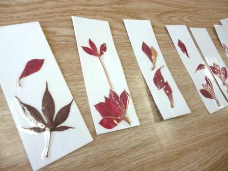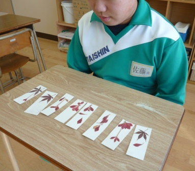 2014年11月6日 10時36分 今週、かやのき学級では、校地内で紅葉した木々の葉を使ってオリジナル「栞」を作りました。色の組み合わせや配置を工夫し、秋の夜長の読書にぴったりの栞となりました。先生方にもプレゼントし、とても喜ばれました。