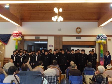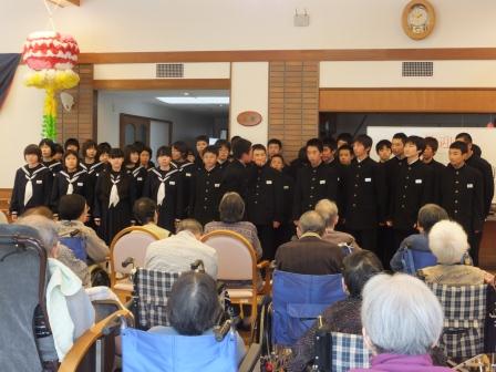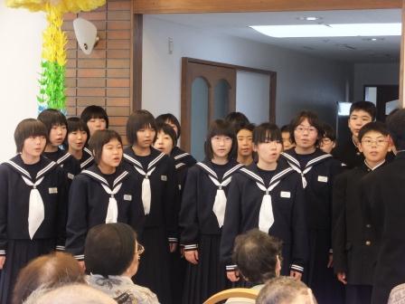 10月15日、1年生は地域の学習で「聖・虹の郷」に訪問し、施設の高齢者の方々と交流しました。童謡や「あのすばらしい愛をもう一度」を心を込めて歌いました。歌のプレゼントに、聴いていたお年寄りの方々が手拍子があり、また一緒に口ずさんでいただきました。合唱の後、サプライズで、施設の職員の皆様から1年生にエール歌を贈られ、そのうまさに聞き惚れてしまいました。とても楽しいひとときで、喜んでもらえて本当によかったと報告してくれました。