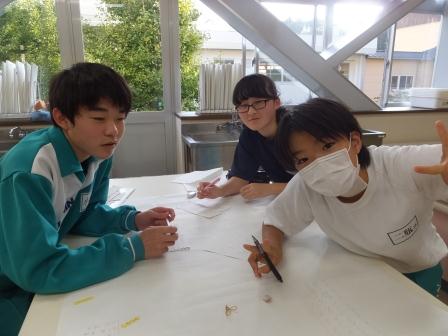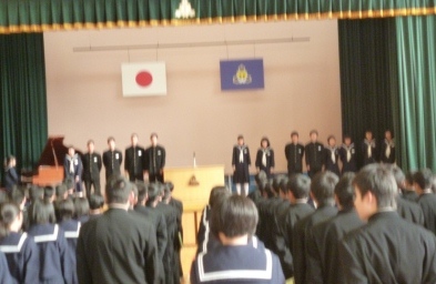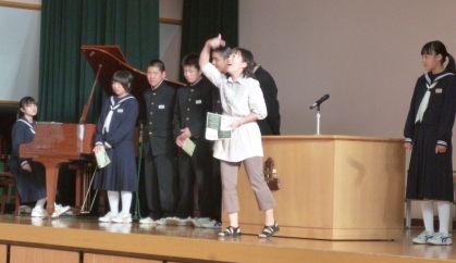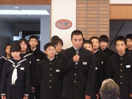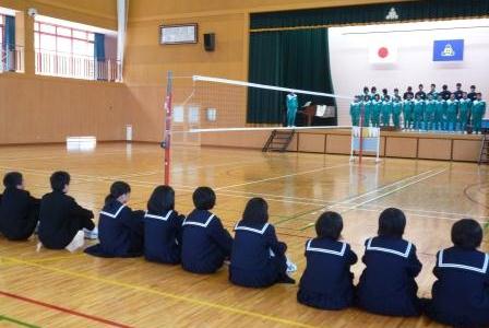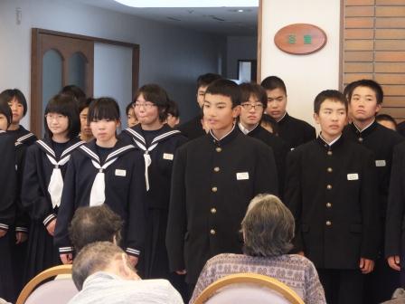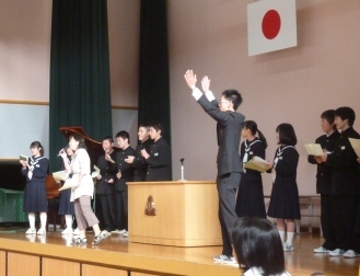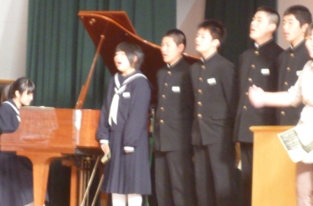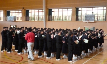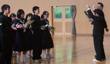 他学年の合唱の仕上がりを聴き、自分たちの演奏に生かしたいと2年2組が、3年1組の先輩の胸をかりました。入退場も含めて先輩たちの演奏に「大きく差が開いています」とため息をもらした2年男子。それでも、「自分たちの演奏に磨きをかけるため練習しよう」と声をかけ合っていました。