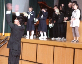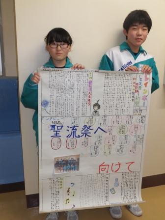 10月20日の朝会は、生徒会主催の朝会。実行委員長から、残り少ない活動日で全校生の力を結集しようとの呼びかけがありました。今日は、実行委員がステージに立ち、校歌そして前々回台風のためできなかった聖流祭テーマソングを全校生で練習しました。朝のためか、なかなか声が出ませんでしたが、ワンポイントレッスンを中目先生に、生徒会顧問の先生方に歌いやすいパフォーマンスを先導していただき、パワーが出てきました。本番での歌に期待しましょう。