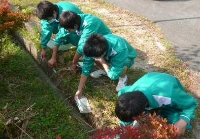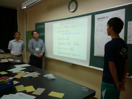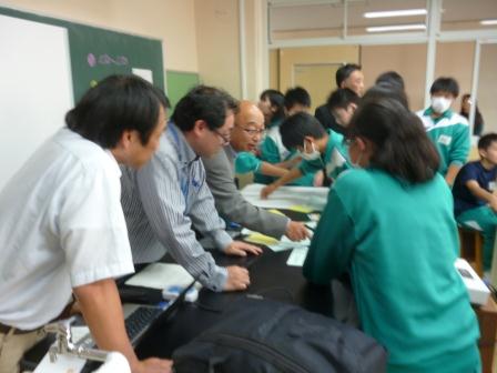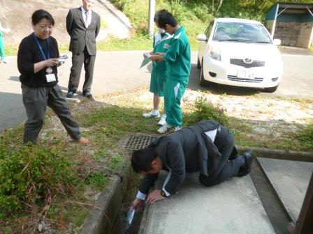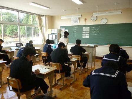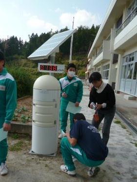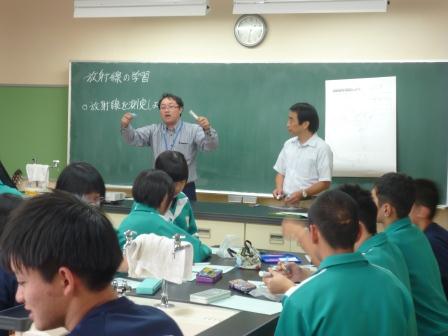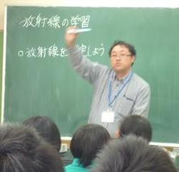 10月9日、中間テスト2日目のこの日、テストを終えて5校時目に3年生は放射線の学習をしました。今回は、徳島大学白河支援チームの譽田教授、佐瀬准教授、環境省除染情報プラザ円谷さん、三浦さんに来校していただき、学校周辺の放射線を測定し安全な生活をおくるための考えを深める授業をしました。
