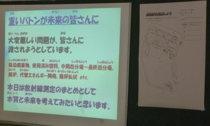 測定の注意事項を聴いて早速、校地内を測定した3年生。数値の高い場所がどこかということに関心が集まりました。測定結果を地図上にあらわし、確認し合いました。全体の結果を基に、佐瀬先生から放射線の正しい知識、集まりやすい場所、福島県の線量の現状、わたしたちの未来と課題そして未来に向けてわたしたちにできることをお話ししていただきました。私たちが健康で長生きすること、放射能問題の解決について一人一人が果たす役割、使命を再認識した3年生でした。