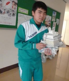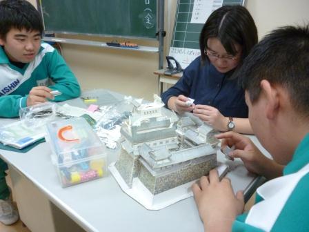世界遺産「姫路城」の製作に挑戦している学芸部。7月の終わりからスタートし、いよいよその姿の全体像が見えてきました。作成途中で、あまりにも細かい作業に気持ちが萎えてきたこともありましたが、顧問の添田先生の粘り強い励ましと3年生最後の作品に賭ける佐藤君の熱い気持ちが部員を導きました。作品は完成後、聖流祭で披露する予定です。ぜひ力作をご覧になってください。