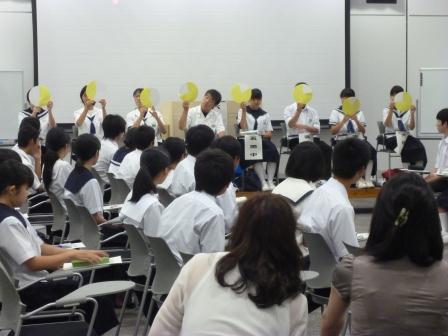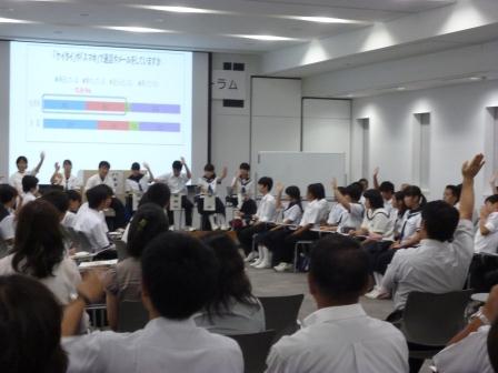 8月5日、白河市「いじめ」について考える中学生フォーラムが開催されました。大信中からは生徒会役員の4名が参加しました。まず、昨年度からの取り組みの成果がどのぐらいか、各校のパネラーの方に円グラフを使って表してもらいました。各学校の様子を見ると、約半分の学校から80%程度まで成果があった学校がありました。