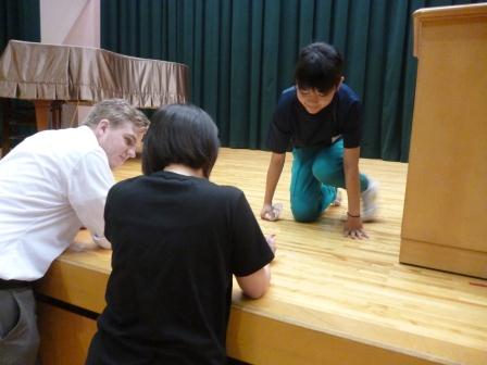 2014年8月6日 10時31分アシュリー先生が8月に帰国され、アメリカから英語指導にジャレット先生が大信中においでくださいました。日本語はこれからどんどん上達することが、お話ししてわかります。今日は体育館のうだるような暑さの中、英語弁論の指導をしていただきました。
