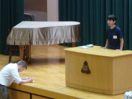アシュリー先生が8月に帰国され、アメリカから英語指導にジャレット先生が大信中においでくださいました。日本語はこれからどんどん上達することが、お話ししてわかります。今日は体育館のうだるような暑さの中、英語弁論の指導をしていただきました。
