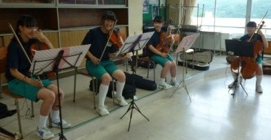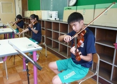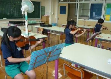改修工事の作業音は、夏季休業中は容赦なく続きますが、音楽部は自分たちの楽曲に集中して頑張っています。