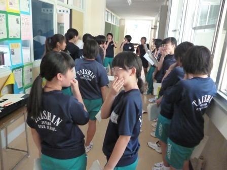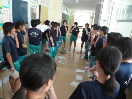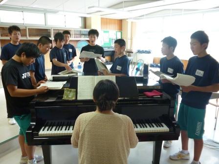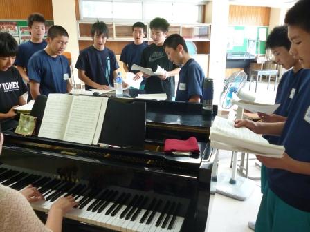 県中体連総合大会が終わり、本格的に始まった特設合唱部。午後からの練習は、暑さと体力の勝負ですが、一人一人の目標を具体的に持ち、頑張っています。パートごとの練習は、ほとんどが2・3日前から始まった男子にとっては特訓が必要ですが、女子は自分たちで練習できるようになりました。これからの3週間での練習が勝負です。