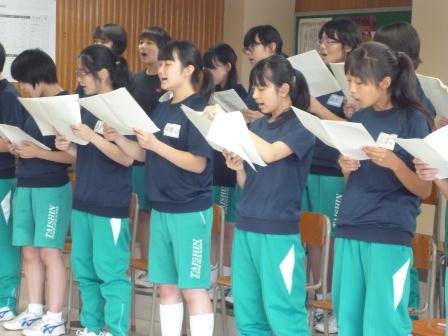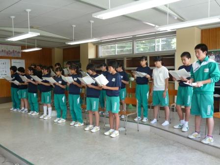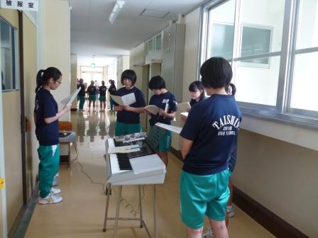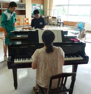 県中体連総合大会が終了していないために全員での練習はできませんが、本日から集合できるメンバーで課題曲の練習が始まりました。中学生の気持ちをそのまま表現した「桜の季節」は、「歌えば歌うほど入り込みます」と話す部員のみなさん。ぜひ、素敵なハーモニーをこの夏、響かせてほしいと思います。