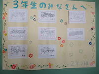 今月の学級新聞が学習室前廊下に掲示されています。1,2年生の新聞には卒業する3年生へのメッセージが、3年生の新聞には1,2年生の後輩へのメッセージが書かれていました。先輩後輩関係なく仲が良いことは「あったか大信中」の良いところです。
