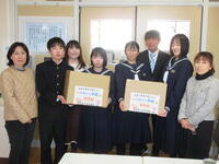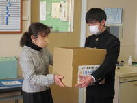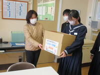 1月30日(月)お昼休み、大信商工会女性部の方が来校されました。受験を控えた3年生を応援したいと、3年生全員に「いい~予感」にかけて「伊予柑」をプレゼントしてくださいました。それに対し、代表生徒が「3年生全員で最後まで頑張っていきます。」と力強くお礼の言葉を述べました。バンダナにお手紙と伊予柑が包まれていました。生徒は、今日からバンダナをハチマキがわりに頭に巻いて、集中して勉強に取り組むことでしょう。地域の方々の温かいお心遣いに感謝いたします。