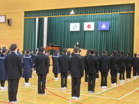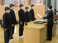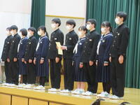 1月10日(火)第3学期始業式が行われました。また、始業式終了後には、新生徒会役員、新専門委員長、3学期学級委員長の任命を行いました。朝、昇降口で生徒の元気な笑顔を見ることができ、ほっとしました。「今年の目標」「3学期の目標」は何でしょう。気持ち新たに前を向き、自分の目標に向かって努力してほしいと思います。