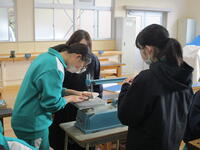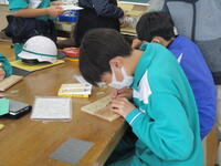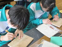 12月8日(木)3年生の美術の授業では「木彫ブックエンド」を制作中です。今日は美術室でなく、技術室での授業です。思い思いのデザインを木材に描き、彫刻刀で掘ったり、糸鋸で切ったり…。進み具合はそれぞれでしたが、お気に入りのブックエンドの完成を楽しみに真剣に制作に取り組んでいました。