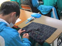 2022年12月6日 14時59分12月6日(火)2年生の5,6校時の授業は、家庭科でした。今日の課題は「刺し子」。全体の3分の2を完成させることが目標です。時々、糸がからまったり、同じところを2度縫ってしまったり、ハプニングがあるようでしたが、自分で考えたオリジナルデザインに全員が静か~に取り組んでいます。完成が楽しみです。