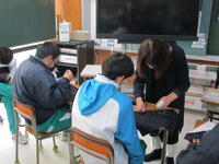 12月6日(火)2年生の5,6校時の授業は、家庭科でした。今日の課題は「刺し子」。全体の3分の2を完成させることが目標です。時々、糸がからまったり、同じところを2度縫ってしまったり、ハプニングがあるようでしたが、自分で考えたオリジナルデザインに全員が静か~に取り組んでいます。完成が楽しみです。