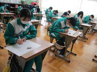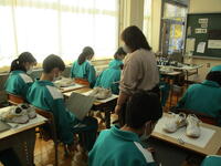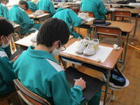 11月10日(木)6時間目、2年2組は美術の授業で上履きのデッサンをしていました。自分の上履きをジーっと見つめ、今日は「つま先の部分」と「ひもを通す穴」を描いていました。つま先の部分は形をよく観察すること、ひもを通す穴はバランスよく配置することを全体で確認して、それぞれが集中して個人の制作に取り組みました。