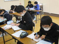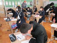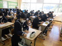 11月2日(水)3年生の総合学習の時間は、高校入試の面接試験についてDVDを見たり、県立高校の入学願書について説明を受けたり、受験に向けての心構えについて学級担任より説明がありました。話を聞く姿からは、緊張感が伝わってきました。まだ少々早いようですが、入学願書を書くにあたり、住所、保護者氏名、生年月日、受験学科…、今のうち色々と確認しておかなければならないことがあったようです。