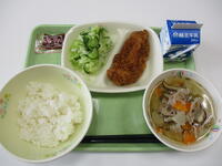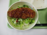 9月14日(水)の給食は、新人戦応援給食でした。今日のメニューはソースカツ丼です。ご飯にゆでキャベツをのせ、その上に福島県産ロース豚カツをのせ、ソースをかけていただきました。サクサクした大きなロース豚カツに生徒も大満足です。大信給食センターの皆さんにおいしい給食で応援していただき、これからまた部活動に力が入ります。来週の新人戦に向かって頑張ります!!今日もおいしい給食ごちそうさまでした。