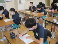 9月2日(金)5時間目、修学旅行事前指導を行いました。修学旅行のしおりを使って、約束や心構え、細かな日程を確認しました。先生の話をメモしたり、大切なところには線を引いたり、わくわくする気持ちを落ち着かせながら真剣に取り組んでいました。教室には、雨男に負けじ…と たくさんのテルテル坊主がゆらゆら。生徒の思いが届き、よい旅行になるに違いありません。
