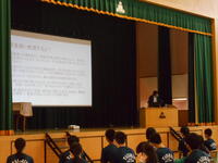 7月11日(月)6時間目、体育館で薬物乱用防止教室が行われました。今年度は、寿泉堂松南病院の看護師さんを講師としてお招きし、アルコールが体に及ぼす影響についてご講話いただきました。アルコールの健康障害について生徒が正しく理解し、自分の体を大切にしていくことを改めて確認する時間となりました。また、講話の中でカフェインについてもお話しがあり、生徒は講師の先生の話に真剣に耳を傾けていました。