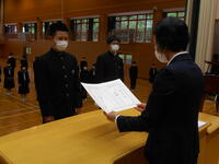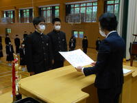 5月16日(月)全校朝会が行われました。その中で2つ、表彰を行いました。1つは、交通無事故達成(年度間無事故)、2つ目は、野球部の第21回さつき杯準優勝です。交通無事故は、令和4年3月31日までで8845日の達成です。9月2日で9000日達成となります。登下校の自転車、安全タスキ、ヘルメットの着用など交通安全に十分に気を付けてほしいと思います。