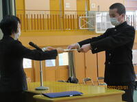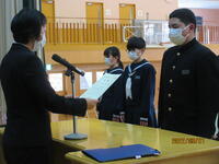 3月1日(火)、学校賞授賞式が行われました。皆勤賞9名、精勤賞9名、功労賞41名、校内学習コンクール最優秀賞12名、優秀賞55名の表彰が行われました。呼名された際、大きな声で返事をし登壇する姿からは自信と頼もしさを感じました。賞をもらった人だけでなく、今年度一年間、生徒一人一人が自分なりに、努力したり、頑張ったりしたことがあると思います。自分自身の努力や頑張りは、自分の中の宝物として生涯にわたって大切なものとなることと思います。