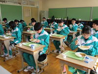 「僕たちのために毎日給食を作ってくださり、ありがとうございました。毎日とてもおいしかったです。感謝しています。今日は最後なのでたくさん食べます。」(2組男子)