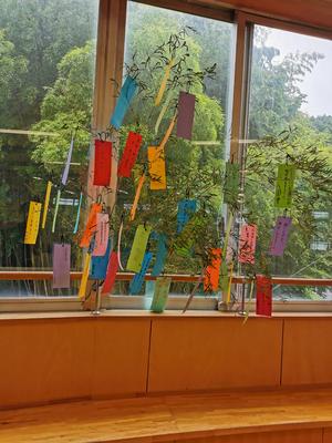 2020年7月7日 19時29分本日は七夕です。年に一度だけ織り姫と彦星が会うことができると言われている日です。本校の裏に竹林があり、用務員さんがちょうどいい竹を切り出してくれました。そこで各学年で短冊をつくり、願い事を書いて飾りました。3年生は受験に関する願い、2年生は新型コロナウイルスで我慢していることをやりたいという願い、1年生は期末テストで良い点をとりたいという願いが多く書かれていました。また、元の生活や、新型コロナウイルスの早期収束を願う短冊も多く見られました。